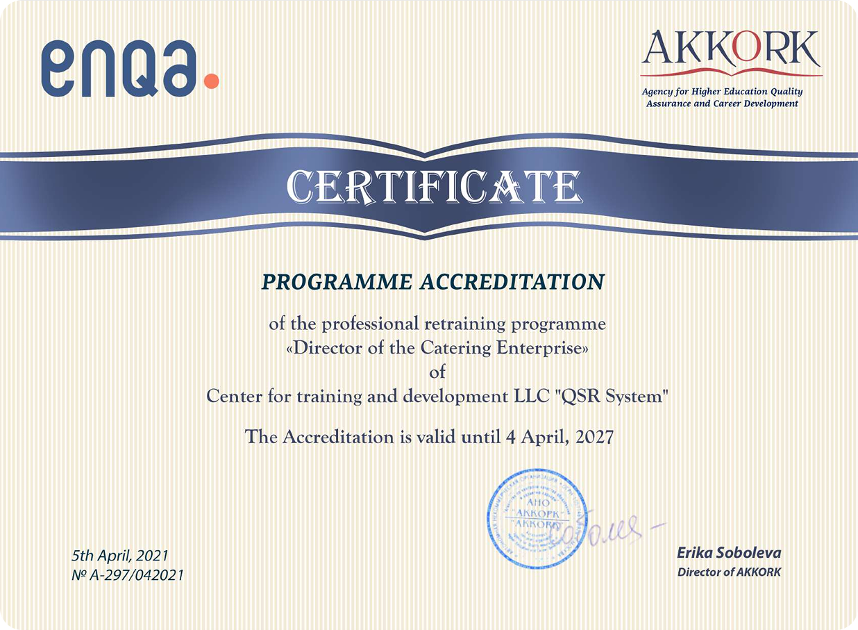 Программа профессиональной переподготовки «Директор предприятия питания» получила международную аккредитацию Агентства по контролю качества образования и развитию карьеры (АККОРК) — экспертной организации по оценке образования.